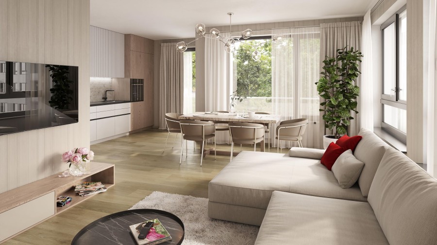 Vybírat lze ze 107 bytů, které jsou postaveny v pěti samostatně stojících bytových domech. Minimalisticky ražená architektura garantuje kvalitní plastová okna s izolačním trojsklem, velkoformátové obklady, keramiku Villeroy & Boch, dřevěnou dýhovanou podlaha, či předokenní žaluzie.