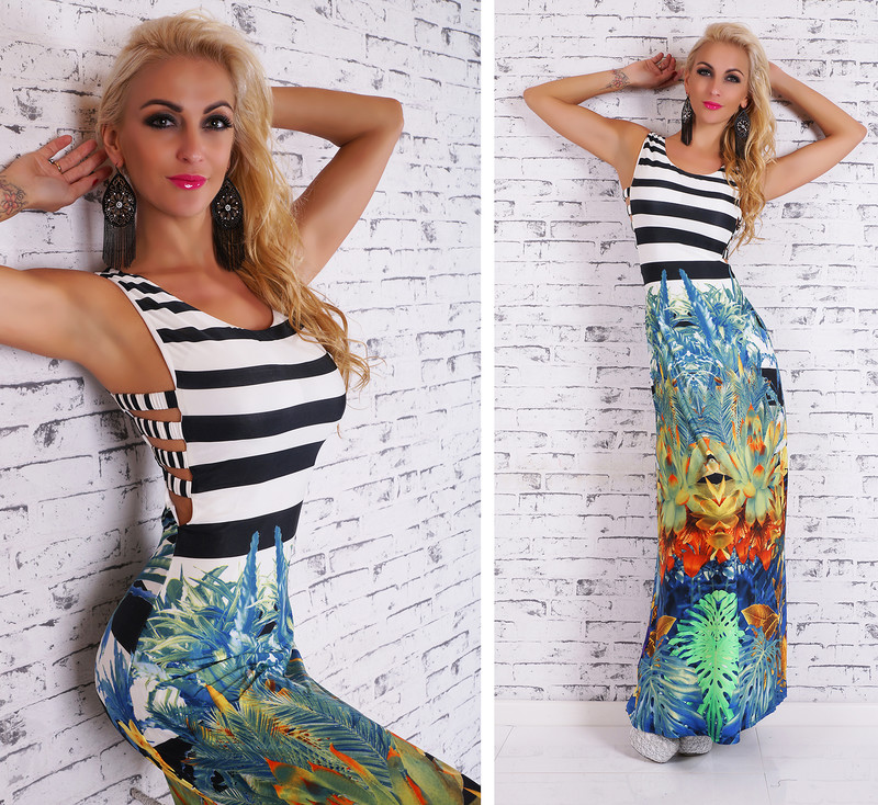 Přímo nádherné jsou dlouhé letní šaty s proužky na prsou a pestrobarevným vzorem od pasu dolů po celé ploše sukně. Pruhy v bílé a černé barvě zvýrazní poprsí a štíhlý pas, pestré obrázky zase povzbudí letní atmosféru, působí lehce a vzdušně. Bez povšimnutí v tomto modelu nezůstane žádná z jeho majitelek.
