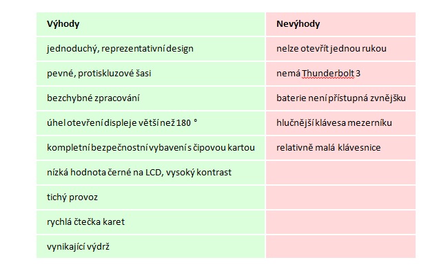 Jednoduše navržený, ale vysoce kvalitní šasi, dobré až velmi dobré vybavení připojovacími konektory, kompletní bezpečnostní vybavení, displej s vysokým kontrastem a Windows 10 Pro společně s tichým provozem si zaslouží jasné doporučení k nákupu.